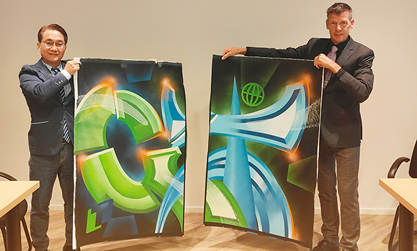 此次签约仪式别具创意与情感意义,高乐伯总裁Kees特别邀请当地知名画家以“G”与“T”两个字母为主题,分别代表Global Paint与Taiho Paint,创作一幅融合东西方艺术语汇的油画作品。签约当日,双方代表共同剪下画作中央,各自保留一半,象征两家企业跨越地域、文化的深度连结。